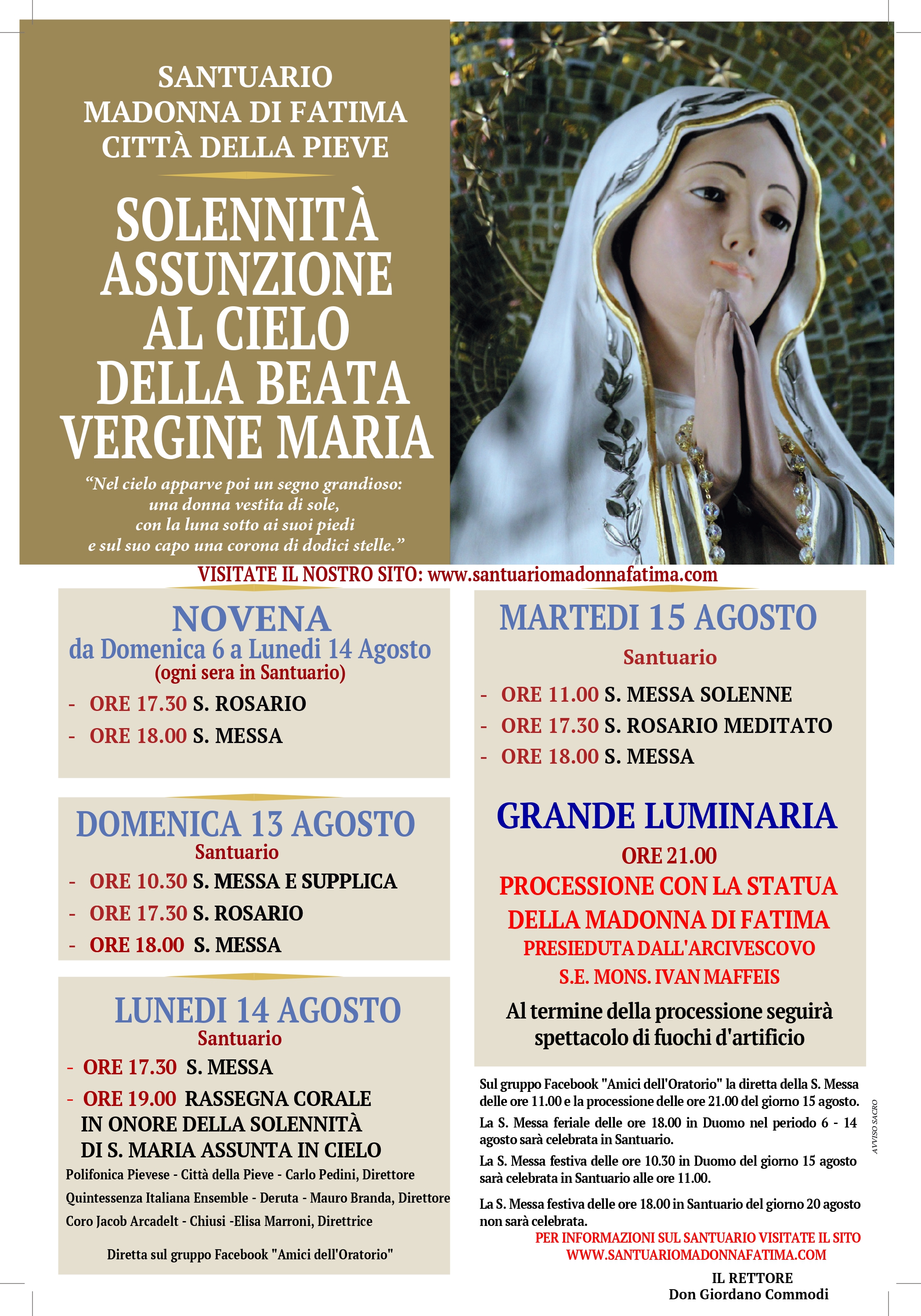 ORE 21.OO PROCESSIONE PER LE VIE DELLA CITTÁ, CON LA STATUA DELLA MADONNA, PRESIEDUTA DA S.E.R. MONS. IVAN MAFFEIS. PARTENZA DAL MONASTERO DELLE SUORE CLARISSE ED ARRIVO AL SANTUARIO DELLA MADONNA DI FATIMA DI CITTÁ DELLA PIEVE.