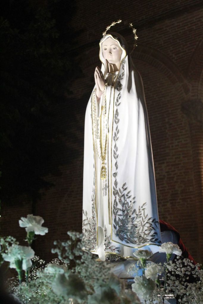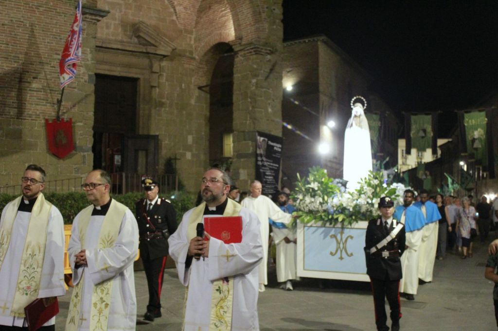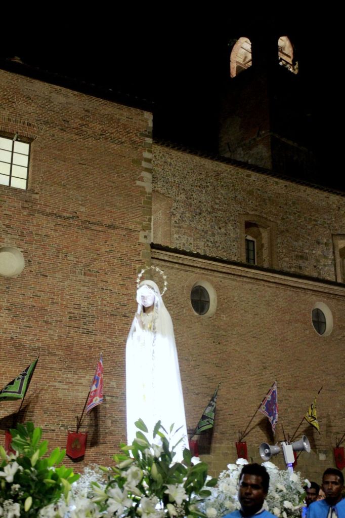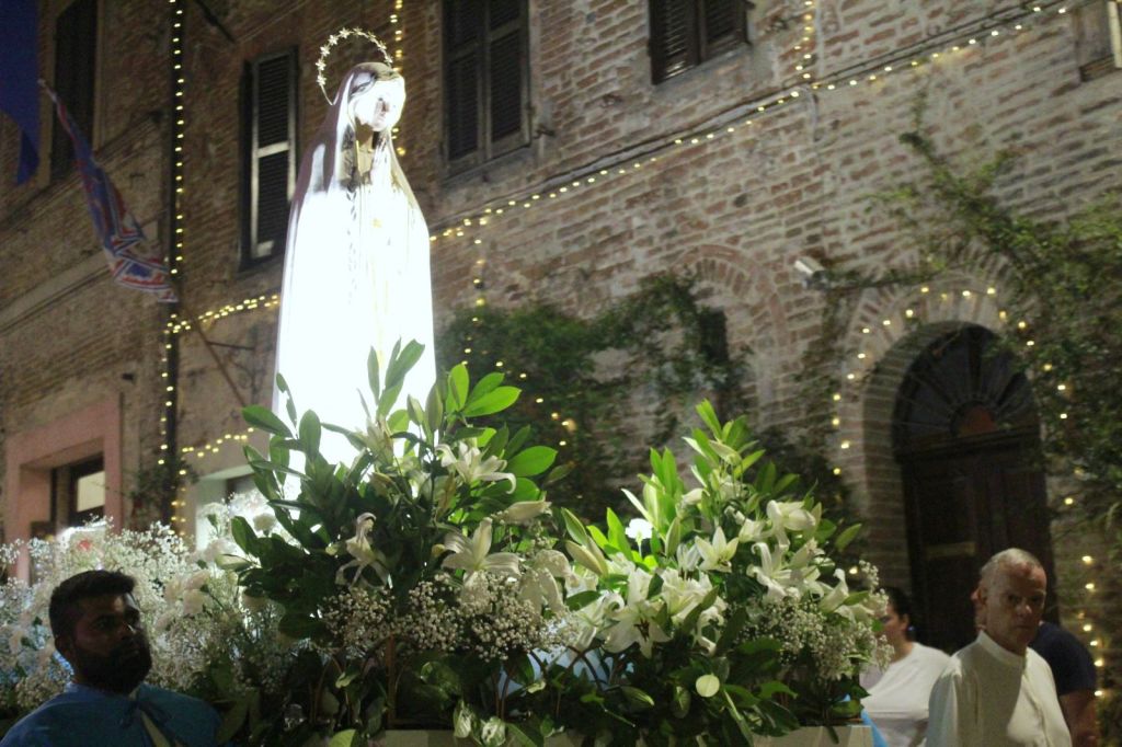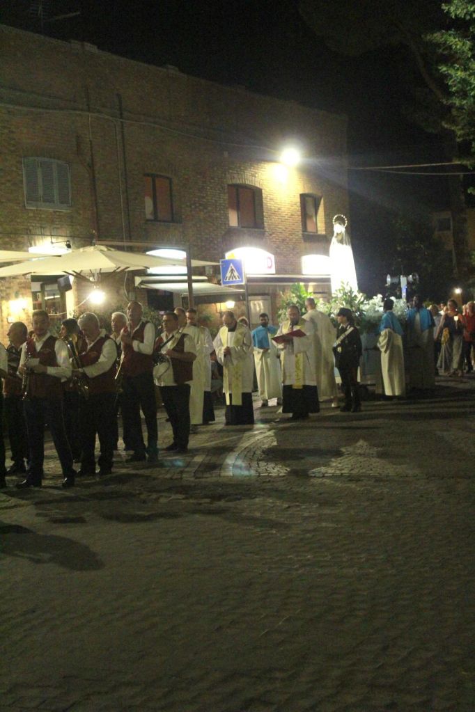 I moltissimi turisti presenti in questo periodo e tutta la popolazione locale hanno così potuto assistere al passaggio della statua della Madonna che é stata prelevata intorno alle 21.00 dal Santuario della Madonna di Fatima e posta sul carro, magnificamente adornato di fiori.