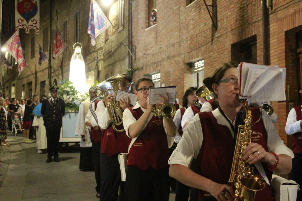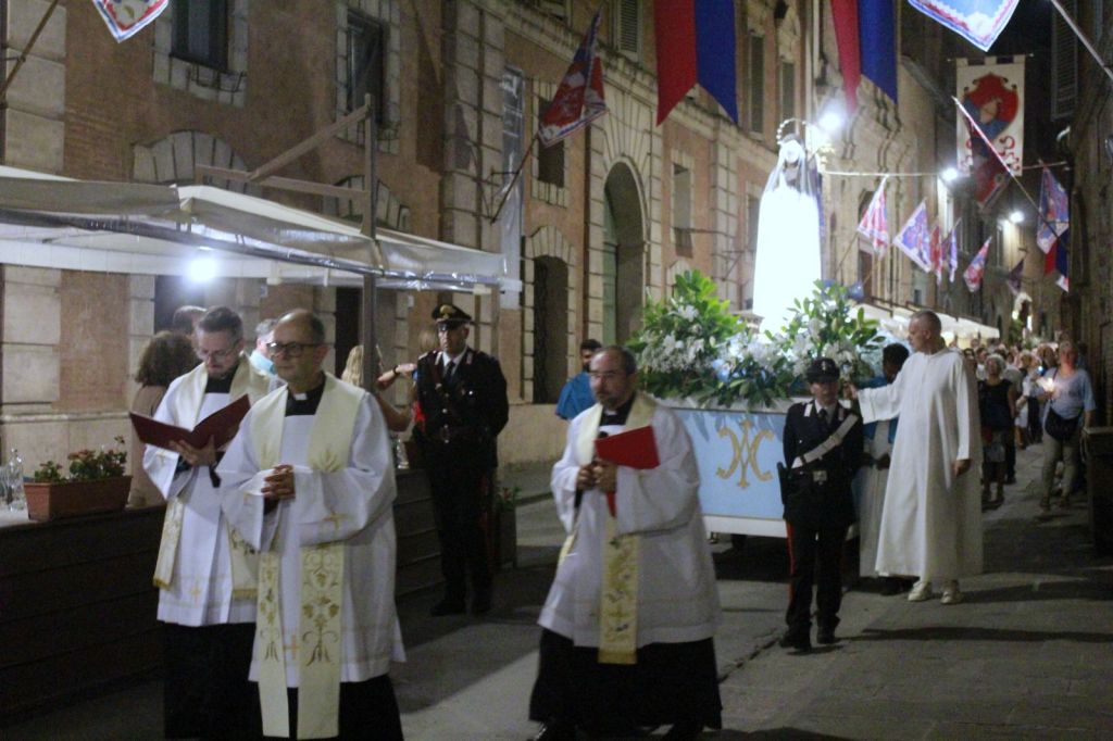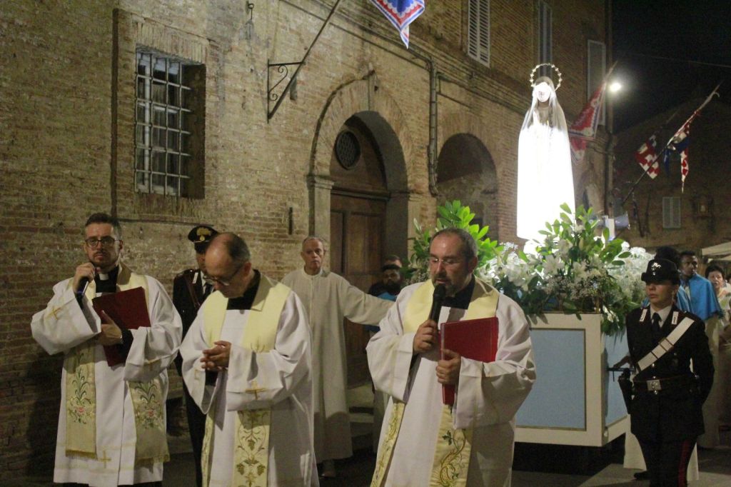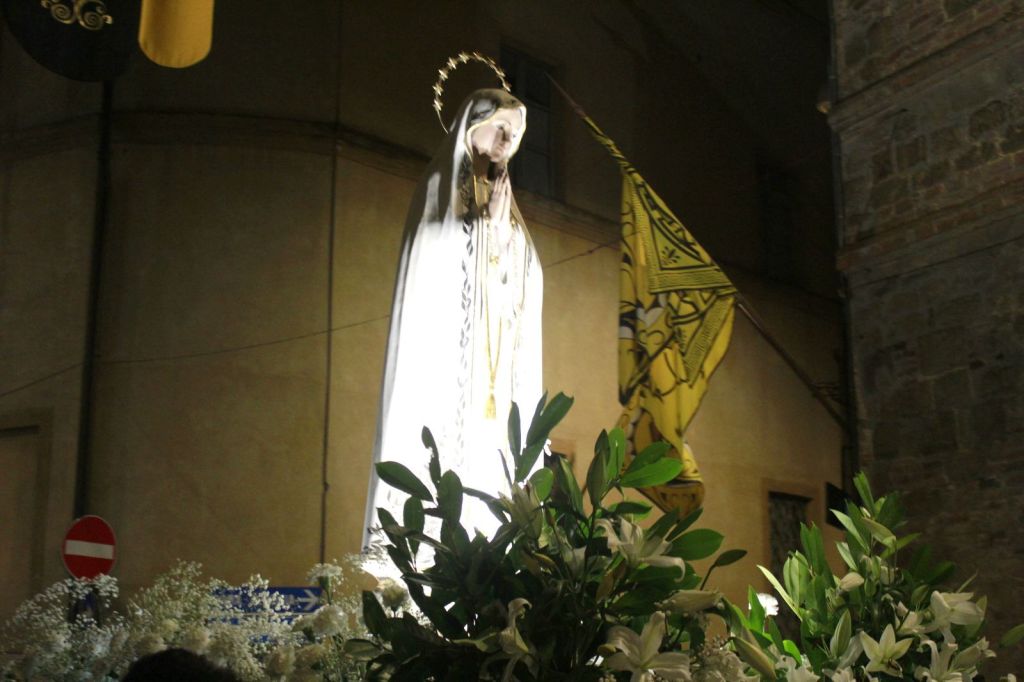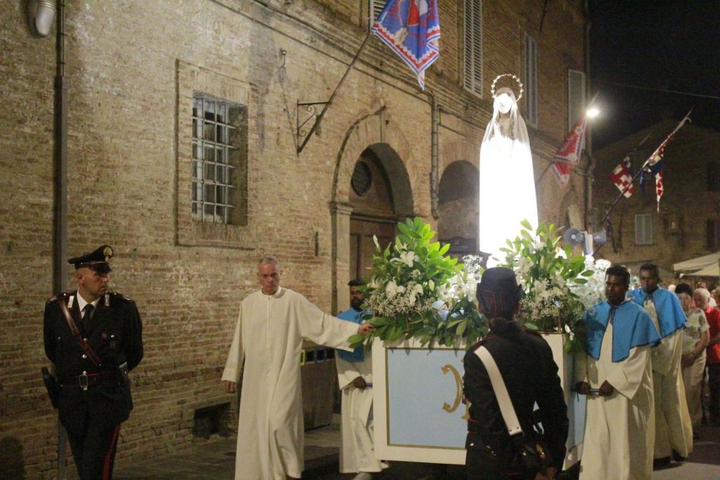 I moltissimi turisti presenti in questo periodo e tutta la popolazione locale hanno così potuto assistere al passaggio della statua della Madonna che é stata prelevata intorno alle 21.00 dal Santuario della Madonna di Fatima e posta sul carro, magnificamente adornato di fiori.