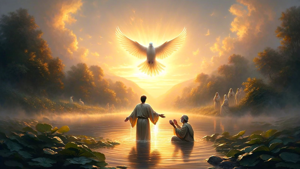 Ed ecco, mentre tutto il popolo veniva battezzato e Gesù, ricevuto anche lui il battesimo, stava in preghiera, il cielo si aprì e discese sopra di lui lo Spirito Santo in forma corporea, come una colomba, e venne una voce dal cielo: «Tu sei il Figlio mio, l’amato: in te ho posto il mio compiacimento».