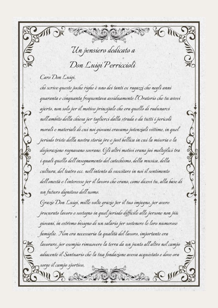 Questo quanto ci è stato possibile recuperare dai libri e dagli scritti disponibili. Ma pensiamo che un valore aggiunto possa derivare soprattutto dalle testimonianze delle persone che Mons. Luigi Perriccioli lo hanno conosciuto di persona. Di seguito ecco quella resa dal Sig. Rino Giuliacci.