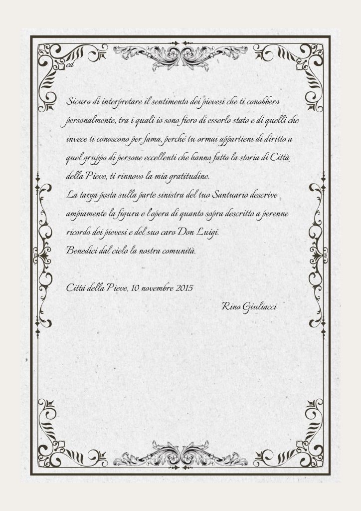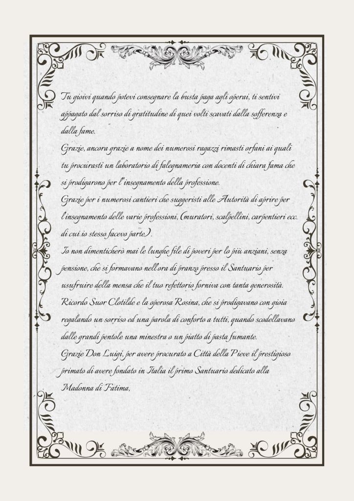 “Allora, punto di partenza del nostro racconto, sarà il 1935, anno in cui Don Luigi ricevette, per mano di Monsignor Angelucci, la consacrazione sacerdotale; e proprio tra le mura di quella chiesa che ne avrebbe vista plasmata la missione spirituale e caritatevole.