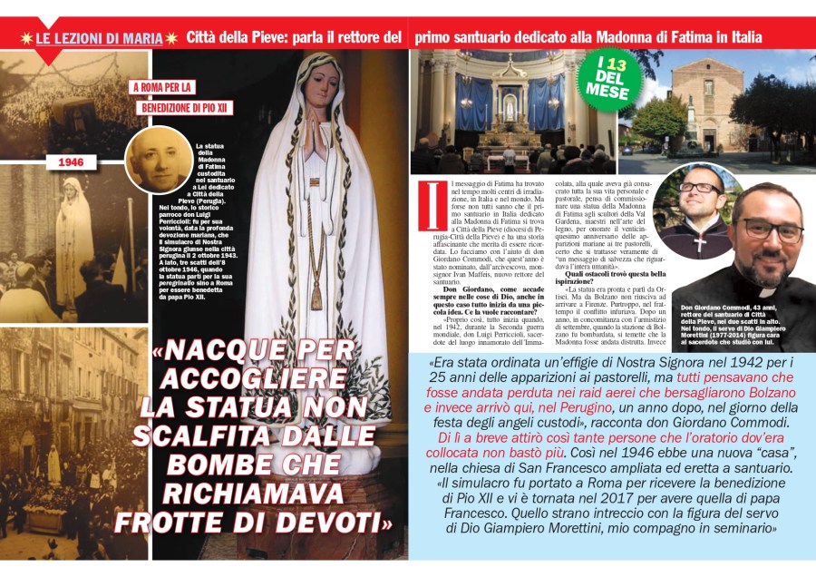 Il messaggio di Fatima ha trovato nel tempo molti centri di irradiazione, in Italia e nel mondo. Ma forse non tutti sanno che il primo santuario in Italia dedicato alla Madonna di Fatima si trova a Città della Pieve (Diocesi di Perugia – Città della Pieve) ed ha una storia stupenda che merita di essere ricordata. Lo facciamo con l’aiuto di don Giordano Commodi che da soli tre mesi è stato nominato, dall’arcivescovo mons. Ivan Maffeis, nuovo rettore del santuario.