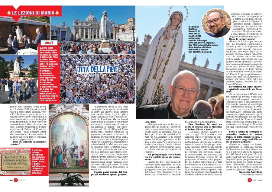 L’attuale rettore del Santuario, Don Giordano Commodi, é stato recentemente intervistato dalla giornalista e scrittrice Francesca Giordano. Si é parlato della storia del Santuario di Cittá della Pieve, il primo in Italia dedicato alla Madonna di Fatima.