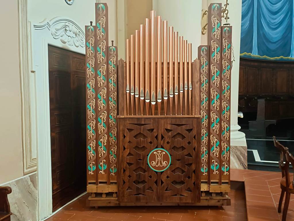 Si è operato quindi aggiungendo una nuova facciata in rame lucidato e laccato e posizionando le sei canne maggiori del Subbasso 16’ ai lati della facciata, valorizzandole con una decorazione pittorica interamente realizzata a mano dalla Dott.ssa Elvira Becchetti che ha anche progettato e realizzato la grata traforata. Tale grata, porta dipinta nel cartiglio centrale la lettera “M” ,iniziale del nome della Vergine a cui è dedicato il Santuario.