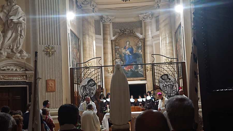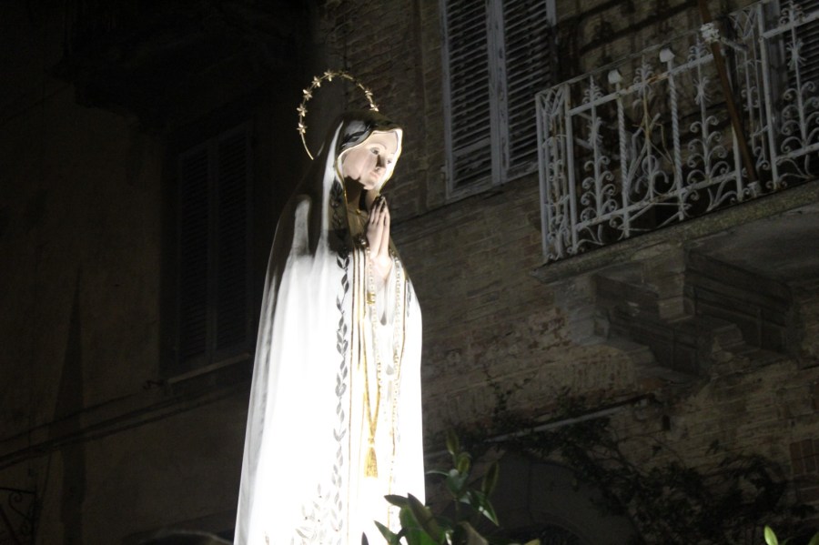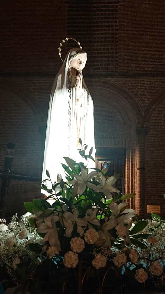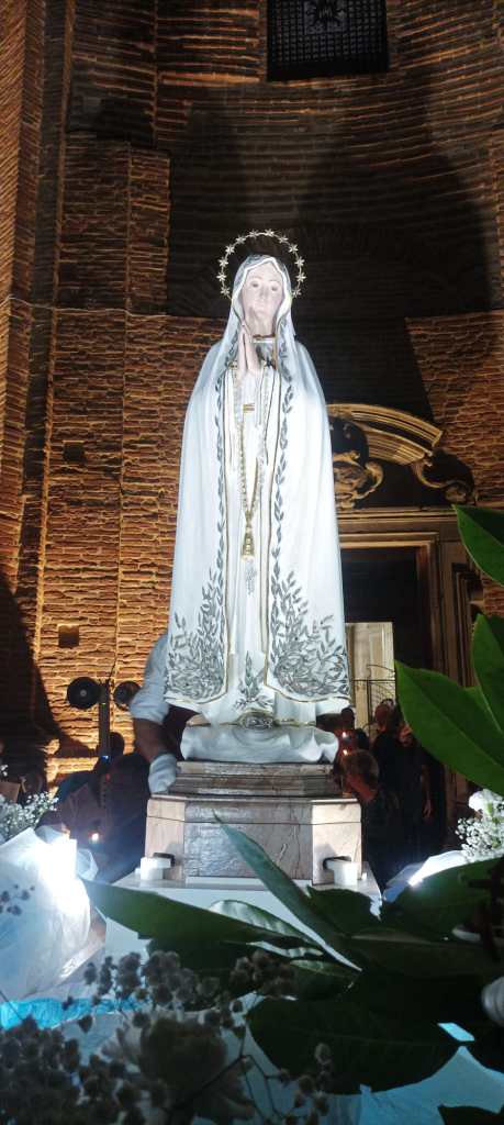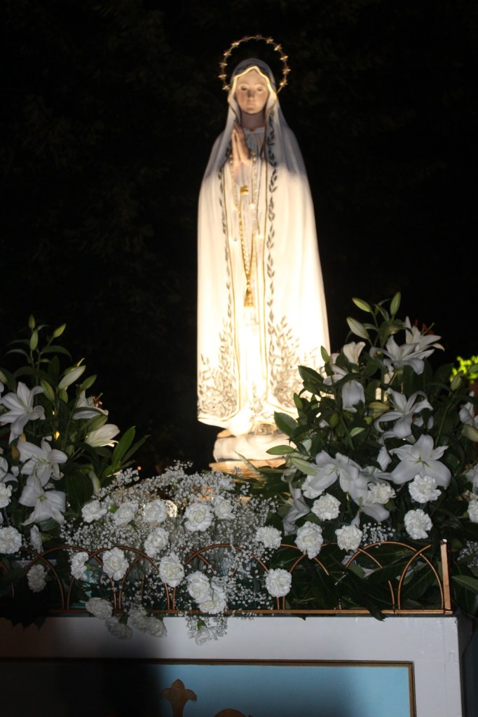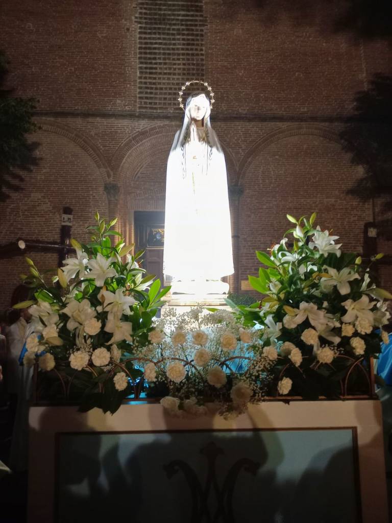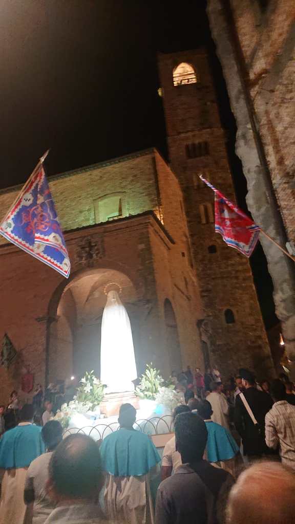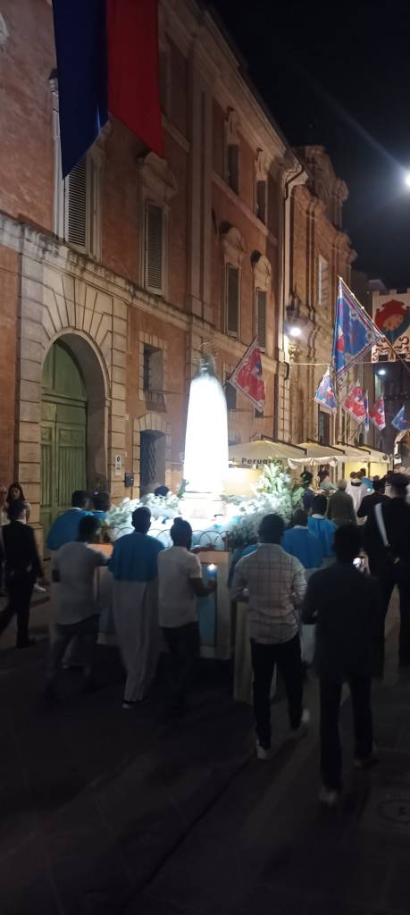 Nell’ambito delle celebrazioni della solennitá dell’Assunzione al Cielo della Beata Vergine Maria, anche questo 15 agosto, a Città della Pieve, si è svolta la tradizionale processione con la statua della Madonna di Fatima. La celebrazione ha avuto inizio dal Monastero delle Suore Clarisse, dove la statua della Madonna si trovava per un momento di preghiera condivisa con la comunità pievese. Successivamente la statua, sistemata sul carro stupendamente adornato di fiori, é stata accompagnata per tutto il suo cammino da tantissime persone che, con i flambeaux in mano, hanno voluto testimoniare la loro devozione alla Beata Vergine Maria cantando e recitando il rosario. Sulle note della Banda Musicale di Città della Pieve il corteo si è mosso per le vie di un centro storico affollatissimo e stupendamente addobbato a festa. Presenti alla luminaria S.E.R Mons. Ivan Maffeis, Arcivescovo della Diocesi di Perugia e Città della Pieve, i parroci Don Simone, Don Giordano, Don Aldo e Don Samy, le rappresentanze delle Confraternite, il Sindaco di Città della Pieve, le forze dell’ordine e i volontari che tanto si sono adoperati per la buona riuscita della manifestazione, tra i quali meritano un ringraziamento particolare i componenti della comunità cingalese di Città della Pieve che dal 2017, con straordinaria devozione, aiutano fattivamente nelle varie attività del Santuario. Durante il percorso la processione si è anche soffermata brevemente davanti alla Cattedrale dei Santi Gervasio e Protasio e alla Chiesa di Santa Maria dei Bianchi. Al rientro, i fuochi d’artificio, lanciati dalla Rocca Perugina, hanno reso omaggio alla Vergine Maria salutando il ritorno della statua in un Santuario già gremito di persone in attesa di assistere al toccante rituale dell’ascesa della statua. Nel tripudio di applausi e di crescente commozione la statua della Madonna é finalmente tornata a casa!❤️🙏