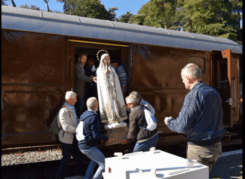 La statua della Madonna è stata portata nella stazione ferroviaria di Chiusi – Chianciano Terme nella serata del 7 ottobre e posizionata all’interno di uno dei due vagoni allestiti a cappella, dove i fedeli hanno recitato il Rosario. Domenica mattina, alle ore 8, dalla stazione di Chiusi – Chianciano Terme, il “treno storico” gremito di pellegrini, molti dei quali bambini e ragazzi, è partito alla volta della stazione di San Pietro in Vaticano, dove è giunto poco dopo le ore 11, fermando prima nelle stazioni di Fabro, Orvieto ed Orte.