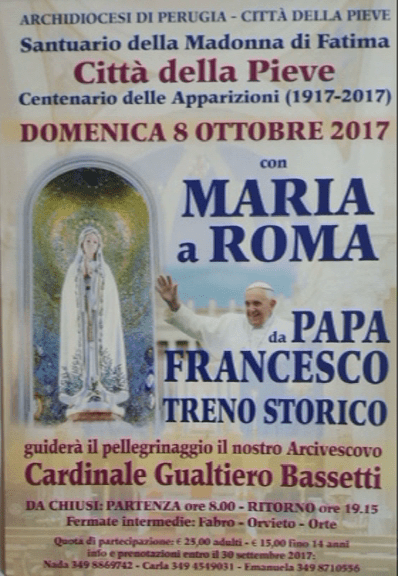 Nel 2017, per celebrare il centenario dell’apparizione della Madonna a Fatima e i 70 anni dall’istituzione del primo Santuario italiano a lei dedicato, quasi 600 pellegrini sono partiti con un treno storico da Città della Pieve con destinazione Città del Vaticano, portando con loro la statua della Madonna. Di seguito una descrizione degli eventi.