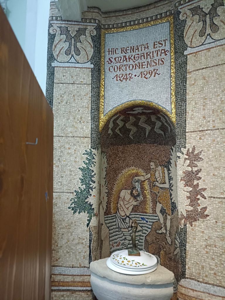 La Chiesa, una pieve romanica, era intitolata anticamente a San Pietro. In questa Chiesa, nell’anno 1247, è stata battezzata Santa Margherita da Cortona e conserva il Fonte Battesimale dove la tradizione vuole che sia stata battezzata la Santa. La chiesa attuale sorge sugli antichi resti e sul finire del 1800 è stata ampliata con l’aggiunta delle cappelle laterali. L’attuale campanile è stato eretto nel 1919, in sostituzione del vecchio che era isolato dalla chiesa.