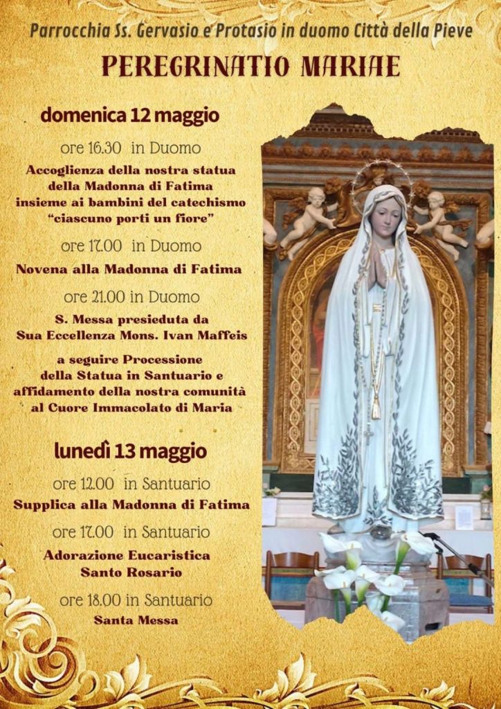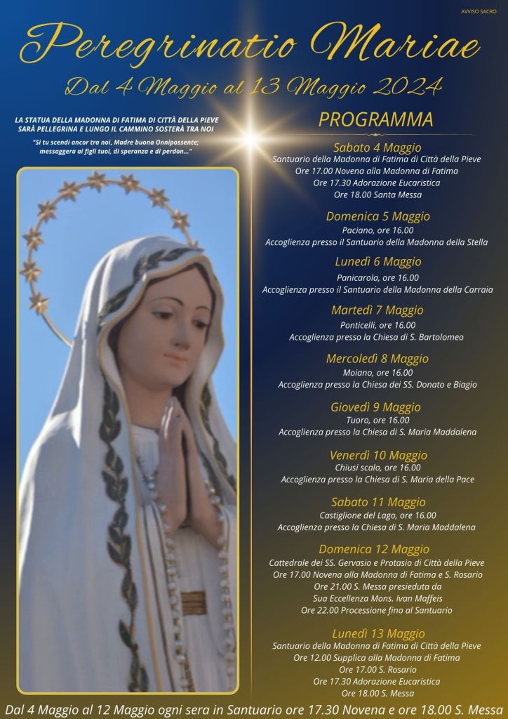 É cominciato nel Santuario della Madonna di Fatima di Città della Pieve il periodo di Novena dedicato alla Madonna di Fatima, nonché data inaugurale del calendario delle celebrazioni riguardanti la Peregrinatio Mariae che si svolgerà dal 4 al 13 maggio 2024.