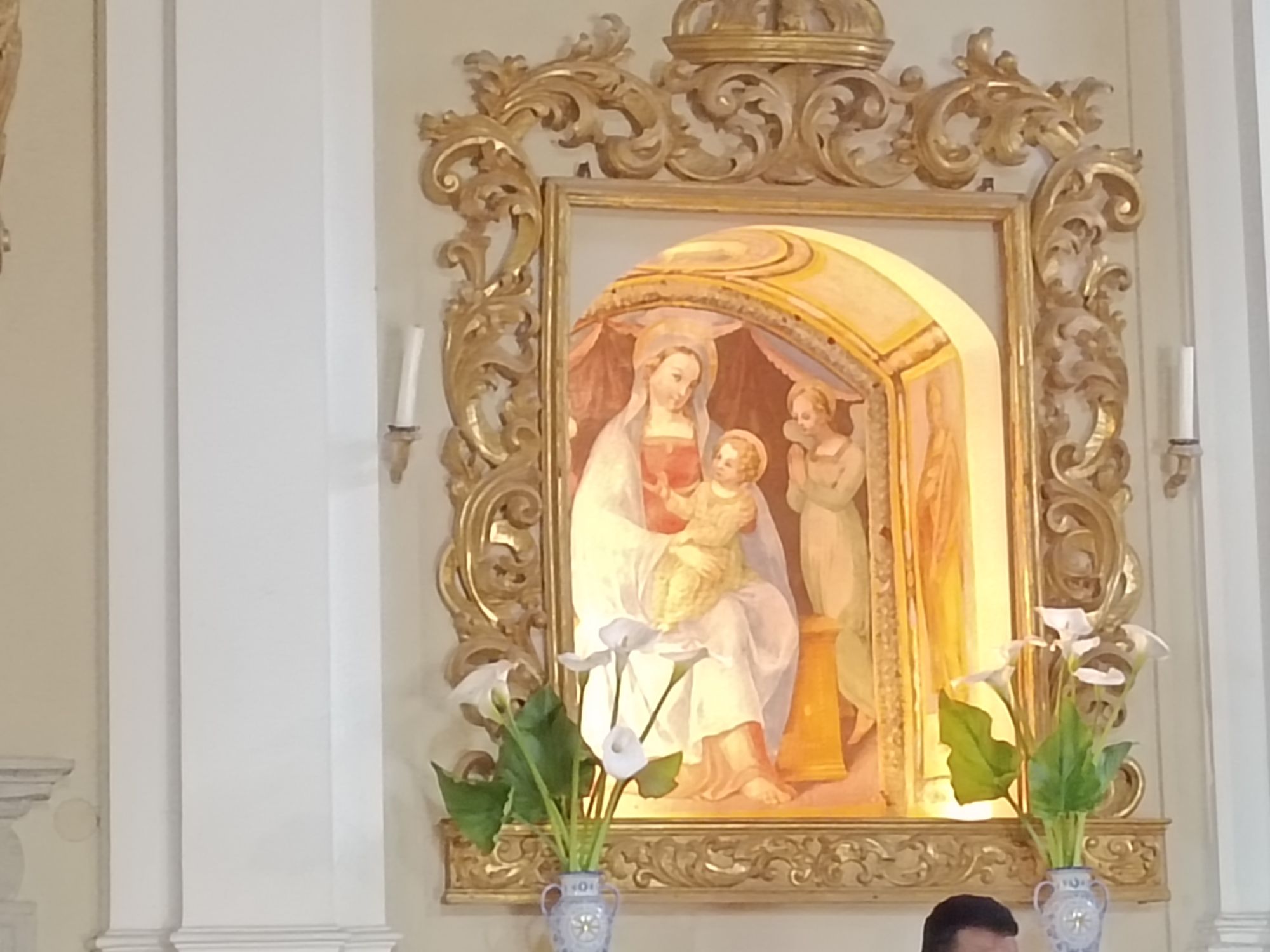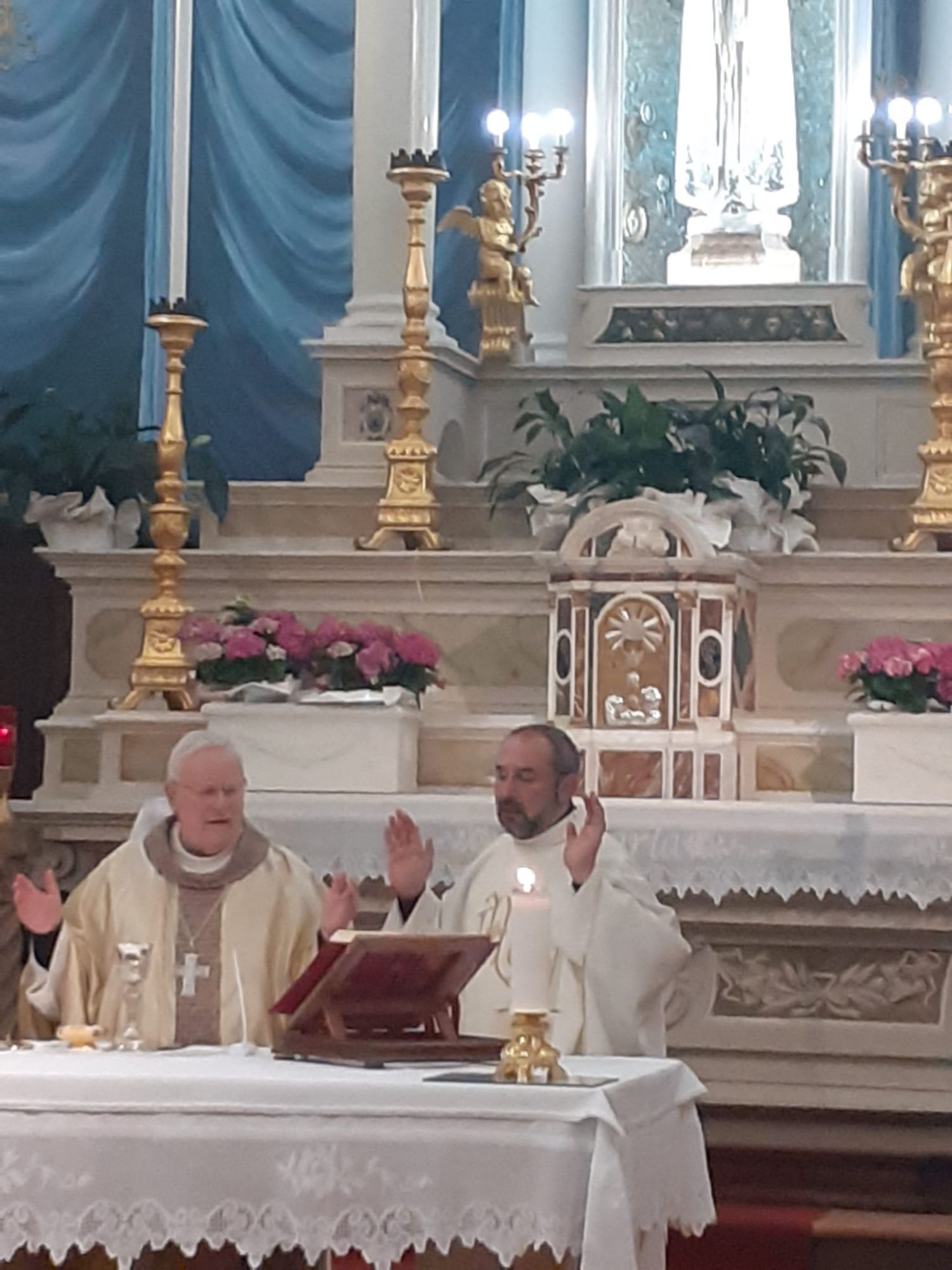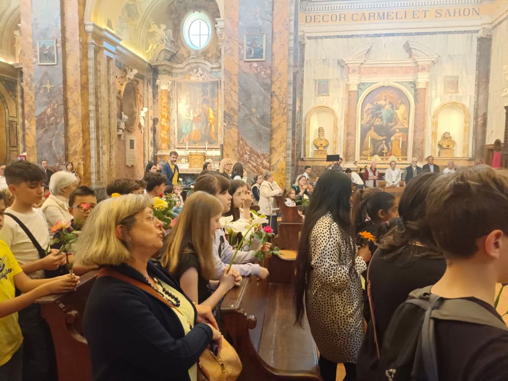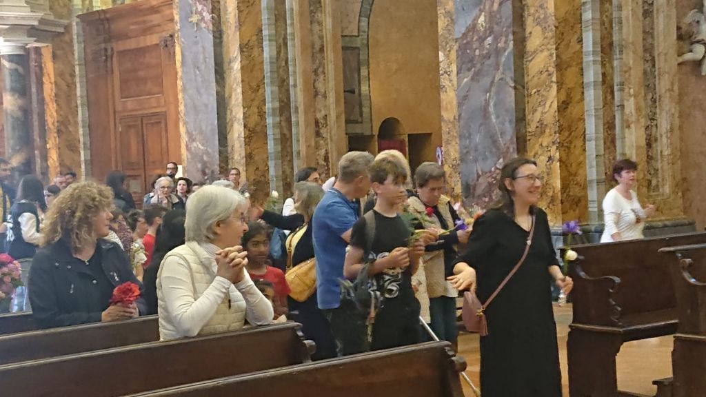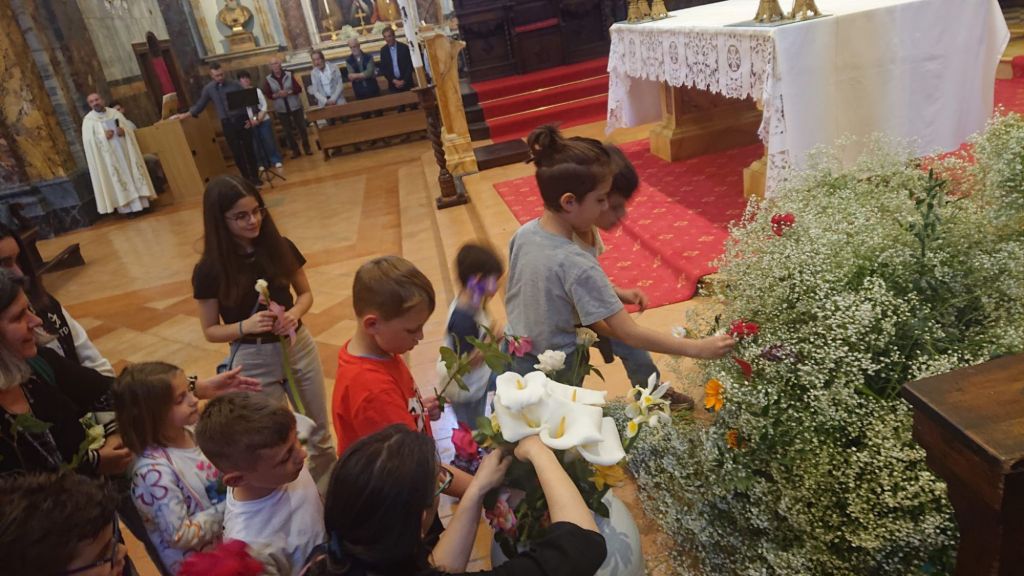 La Madonna ha fatto il Suo ingresso in Duomo accompagnata dalla musica e dai canti che si sono susseguiti per tutta la funzione. Sistemata la statua a fianco dell'altare Don Giordano ha preso la parola ricordando la miracolosa storia dell'arrivo della statua della Madonna. Poi i bambini del catechismo hanno deposto i loro fiori ai piedi della statua della Madonna.