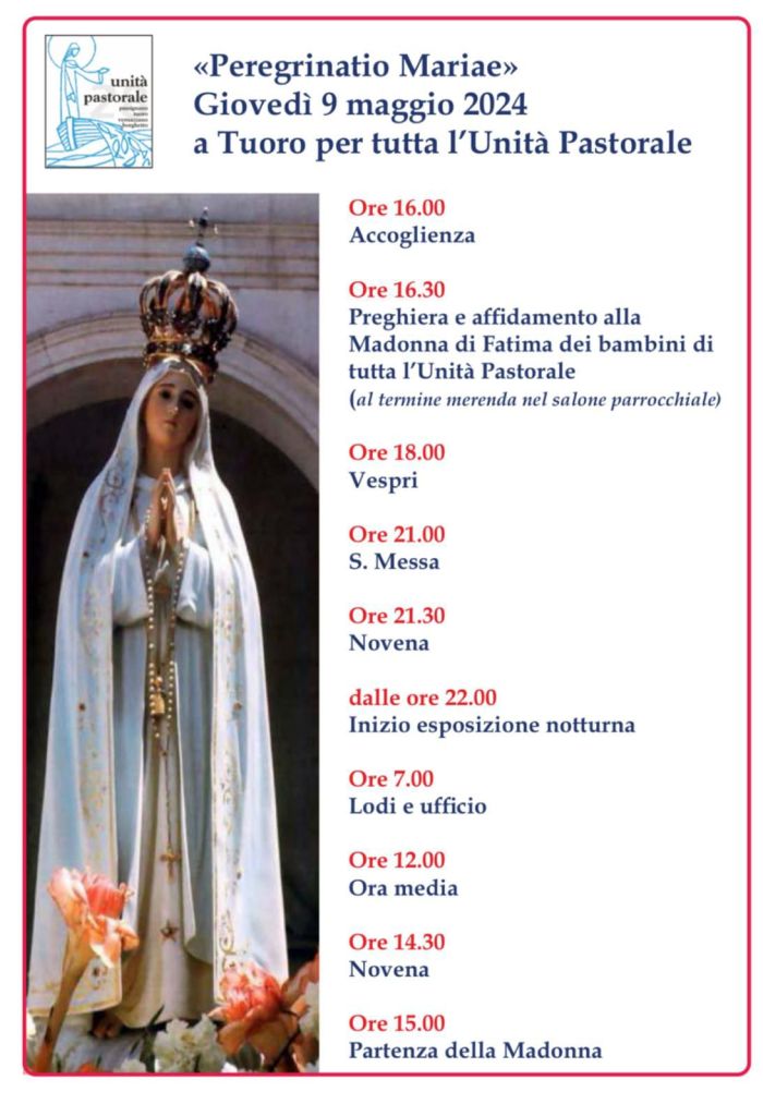Oggi, 9 maggio 2024 poco dopo le ore 15.00, la statua della Madonna di Fatima di Città della Pieve è stata prelevata dalla chiesa dei Santi Donato e Biagio di Moiano e accompagnata da Don Giordano Commodi, parroco di Città della Pieve assieme ad alcuni volontari, sino alla sua quinta destinazione, la chiesa di Santa Maria Maddalena di Tuoro, dove ha ricevuto accoglienza alle ore 16.00.
