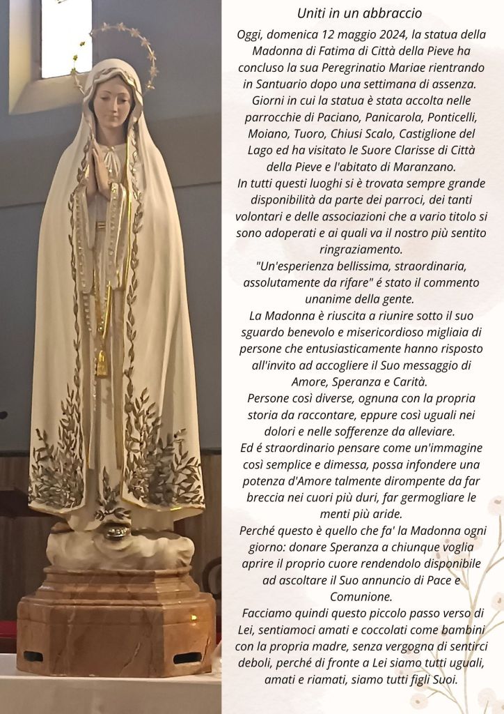 Oggi, domenica 12 maggio 2024, la statua della Madonna di Fatima di Città della Pieve ha lasciato la Casa del Giovane di Castiglione del Lago intorno alle ore 15.00 per essere accolta nella Cattedrale dei Santi Gervasio e Protasio di Città della Pieve, dove era attesa per le ore 16.30.
