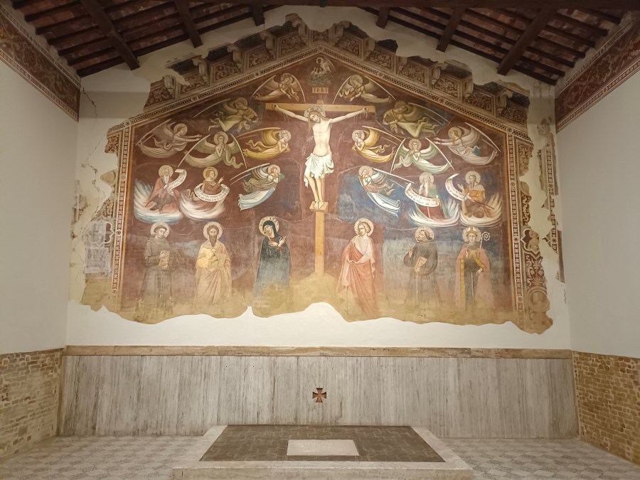 Eppure esso ha un’importanza eccezionale, per il bellissimo ed interessante affresco della “Crocifissione di Gesù volgarmente detto il “Pianto degli Angeli” , per il numeroso stuolo di spiriti celesti che fanno corona alla figura del Redentore morente e sono in atteggiamento di pianto e di preghiera. È da ritenersi che tutto l’Oratorio fosse stato dipinto, come era uso del tempo; ma di queste pitture oggi non rimane più traccia perchè è stato rifatto l’intonaco. La parete dipinta misura sette metri di lunghezza e nove di altezza. Domina nel centro il Redentore pendente dal legno, col volto reclinato sulla destra, con espressione vivissima e soffuso del pallore di morte. La croce grande, conficcata a terra, sorretta nel contrasto di più zeppe alla base; i piedi poggianti sopra una tavoletta, fissa a metà del tronco; al di sopra il mistico pellicano, che simboleggia l’infinita carità del Salvatore dar la vita ai suoi nati; sei angeli da una parte, sei dall’altra circondano il Redentore Crocifisso e piangono l’atroce morte del Giusto. Sono disposti a due per due simmetricamente, come voleva la maniera del tempo. In quei volti atteggiati a devota contemplazione, lo scoramento e la pietà è indicibile; e pare che parlino e dicano cose ineffabili e sovrumane, di amore e di dolore insieme. Le forme agili, con tuniche lunghe, svariate, svolazzanti, che vaniscono all’estremità in leggerissima ed impercettibile nube; e le grandi ali aperte, a forma di rondine, sottili, variopinte, completano il magnifico quadro, e rendono più attraente e maestoso l’insieme. Immediatamente sotto: quattro figure con aureole, posate sopra le nubi multiformi, che col dito della destra indicano il Redentore e con la sinistra sostengono una cartella bianca, dove sono leggende in caratteri gotici. Sono essi due Profeti e due Evangelisti, che danno il bellissimo e indovinato contrapposto del Vecchio e del Nuovo Testamento. I primi dicono che il Messia verrà, e dopo settantadue settimane di anni, per i nostri peccati e le nostre scelleraggini, sarà flagellato, ucciso, e tutti i popoli della terra crederanno in lui. I secondi annunziano che il Messia è venuto, che i Giudei lo hanno crocifisso, che i soldati si son divisi le sue vestimenta, sorteggiandole, e che è tutto compiuto, perchè il Cristo ha esalato dalla Croce l’ultimo respiro. In basso sei figure di grandezza più del naturale poste in linea, delle quali, lì presso alla croce : la ” Vergine Addolorata ” e “l’Apostolo prediletto”. L’atteggiamento e l’espressione del volto dicono tutto io strazio dell’anima, ma sono le due sole figure che mostrano di avere una qualche attinenza con l’idea dominante del quadro; le altre quattro stanno li per semplice decorazione e devozione. S. Francesco, che si riconosce dalle Stimmate, in atto di estatica contemplazione; l’altra figura, dopo quella di S. Francesco è S. Ludovico, Vescovo di Tolosa. Dall’altra parte un S. Bartolomeo, titolare dell’Oratorio, con un coltello, istrumento del suo martirio. L’ultima figura è S. Antonio di Padova, che è uno dei santi più cari e più celebrati in tutte le epoche. Il quadro ha sofferto le ingiurie del tempo. È sparito infatti il fondo di oltremare ed è rimasto il verde e il paonazzetto che servirono di preparazione all’azzurro. I caratteri di questo affresco che è una delle cose più interessanti che esista in Città della Pieve, per la grandiosità della composizione, genialità ed elevatezza del concetto, sono quelli propri dell’arte del trecento, in cui, se predomina l’espressione del sentimento, riesce difettosa la forma e scadente il colorito. Ora confrontando questo dipinto con quelli che si ammirano nella Chiesa di S. Francesco di Asciano, si scorge tra questo e quelli una grande affinità, da dirli quasi usciti da una medesima mano. A questo quadro si riferiva forse una memoria rinvenuta dal P. Franchini, m. c. in cui è detto che nel Refettorio, eravi una pittura del 1384, dove si vedeva la figura del P. S. Francesco, ed altri suoi frati e non di Monaco alcuno. Ciò posto, poichè i caratteri sono quelli della scuola senese e particolarmente della scuola del Barna, abbiamo la convinzione che l’autore del quadro sia quel Nicola di Bonifazio Senese, che verso la fine del 1300, prese dimora in Castel della Pieve e vi rimase per tutta la vita. Fu questi coetaneo e forse compagno di Giovanni d’Asciano, l’autore dei dipinti di S. Francesco d’Asciano, ed entrambi allievi di quel Barna, che lasciò pregevoli affreschi nella Collegiata di S. Giminiano.