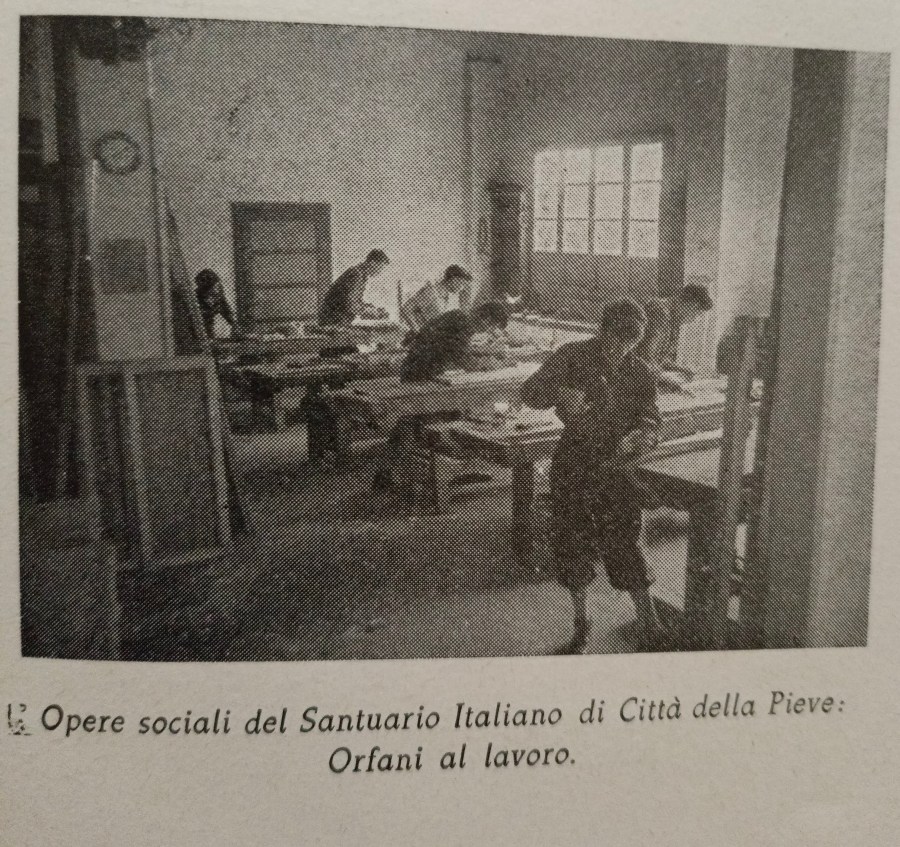 Nel 1939 fu inaugurato il laboratorio-scuola Divina Provvidenza per dare ai giovani di Città della Pieve l’avviamento a un’arte o mestiere. Il 4 aprile il Comune di Città della Pieve rilasciò l’autorizzazione per l’impianto di una falegnameria. Successivamente il signor Luigi di Marco vendette gli attrezzi e i materiali del suo laboratorio di Sant’Agostino. Oltre ad attività pratiche c’erano lezioni di Disegno, Storia dell’Arte, Tecnologia, Liturgia, Musica. Molti giovani, però, partirono per la guerra e subentrò la necessità di assistere moralmente ed economicamente militari, famiglie e sfollati. Il centro divenne allora un luogo di aiuto nel disagio generale. Nel 1941 le autorità pubbliche chiesero il ricovero di tre fratelli orfani e abbandonati. Così il 31 gennaio nacque il Piccolo Rifugio Maria Immacolata per gli Orfanelli diventato poi Opera Salviamo il Fanciullo.